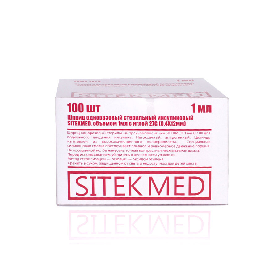 Трехкомпонентный шприц 1 мл, для подкожного вливания инсулина 100U, индивидуально упакованные в блистер, игла надета на шприц. Шприц имеет плавный ход поршня за счёт резиновой манжеты на поршне. Стальная игла inox AISI 304 тройной степени заточки с максимальным проникновением в кожу имеет силиконовое защитное покрытие и снижает болевые ощущения при уколе. На прозрачной герметичной колбе нанесена шкала несмываемой краской. Модифицированный упор для пальцев, имеющий выраженную ребристость, позволяет надежно удерживать шприц во время инъекции. Стерильная блистерная упаковка из нетоксичного материала обеспечивает видимость шприца до вскрытия упаковки и свидетельствует о ее целостности. Особая форма резинового уплотнителя, благодаря идеальному положению на дне цилиндра, гарантирует введение полного объема лекарства. Стерильно, апирогенно, нетоксично, одноразового применения.